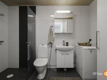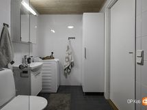 - Sauna, sähkökiuas, kylpyhuone, suihku, suihkuseinä, peilikaappi, kaapit, allaskaappi, pesukoneliitäntä, lattialämmitys, kiinteät valaisimet. Allaskaappi ja allas vaihdettu 2023