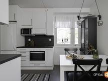 - Jääkaappipakastin, lattialiesi, induktioliesi, liesituuletin, astianpesukone, kaapistot, kiinteät valaisimet.