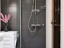 - Sauna, sähkökiuas, kylpyhuone, suihku, suihkuseinä, peilit, peilikaappi, allaskaappi, pesukoneliitäntä, lattialämmitys. Uusittu linjasaneerauksen yhteydessä, uusi seinä-wc.
