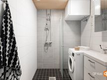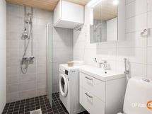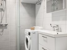Kylpyhuone, suihku, suihkuseinä, peilikaappi, allaskaappi, pesukoneliitäntä, lattialämmitys, kiinteät valaisimet.
