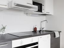 Jääkaappipakastin, erillisuuni, liesitaso, induktioliesi, liesituuletin, astianpesukone, kaapistot, kiinteät valaisimet.