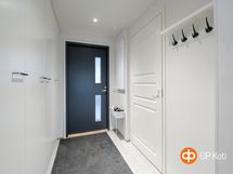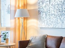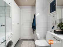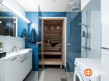 - Sauna, sähkökiuas, suihku, suihkuseinä, peilikaappi, allaskaappi, pesukoneliitäntä, lattialämmitys, kiinteät valaisimet.