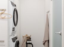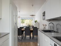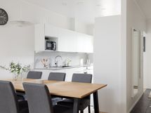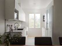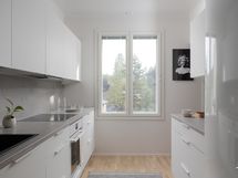 - Liesi: induktio, erillisuuni. Työtasot: laminaatti. Kylmäsäilytys: jääkaappi, pakastin. Varustus: astianpesukone, kiinteät valaisimet, liesituuletin / hormi.