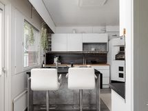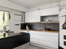 - Liesi: leivinuuni, induktio, erillisuuni. Työtasot: puu, laminaatti. Kylmäsäilytys: jääkaappi, pakastin. Varustus: liesituuletin, mikroaaltouuni, astianpesukone, kiinteät valaisimet.