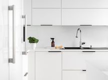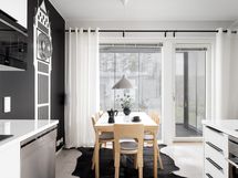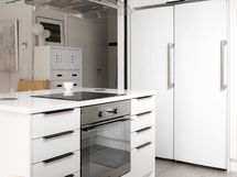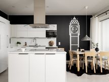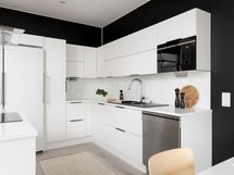 - Liesi: induktio, erillisuuni. Työtasot: laminaatti. Kylmäsäilytys: jääkaappi, pakastin. Varustus: mikroaaltouuni, astianpesukone, kiinteät valaisimet, liesituuletin / hormi. Lemans kulmakaappi, integroitu silityslauta, apteekkarin kaappi, hanassa on ulosvedettävä juoksuputki