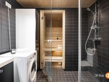 - Sauna, sähkökiuas, kylpyhuone, suihku, suihkuseinä, peilikaappi, kaapit, allaskaappi, pesukoneliitäntä, lattialämmitys, kiinteät valaisimet.