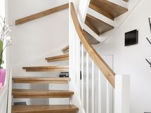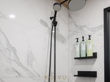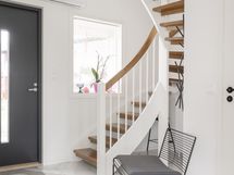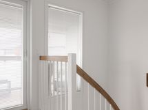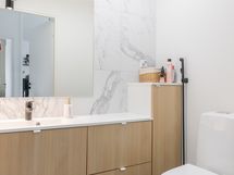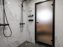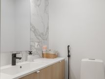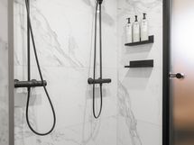 - Varusteet: kaksi suihkua, kiinteät valaisimet. Vaalea kylpyhuone, jossa mattamustat suihkut ja sävyyn sopivat shampoopullotasot ja pyyhekoukustot. WC: Molemmissa kerroksissa erillinen wc. Kalusteseinällä laatta, muut seinät maali. Laadukkaat kiintokalusteet. Mattamusta hana bidesuihkulla.