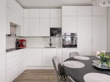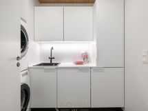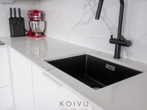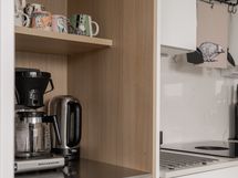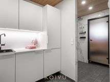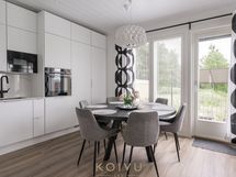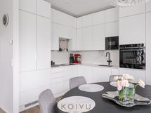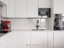 - Varusteet: pakastin, jääviileäkaappi, integroidut kodinkoneet, integroitu astianpesukone. Työtaso: kivitaso. Liesi: liesituuletin, erillisuuni, induktioliesi, mikroaaltouuni. Avonainen keittö. Laadukas ja korkeatasoinen varustus ja kiintokalusteet. Kestävä Dekton kivitaso, myös kalustevälissä. Aamiaiskaappi taiteovella. Siemensin integroidut kodinkoneet. Mattamusta alhaalta kiinnitetty allas ja matta musta allashana, jossa ulosvedettävä juoksuputki pesuja helpottamaan. Laatikostot tuo helppoutta säilytykseen ja käyttöön. Kaapiston kattoon asti, joten säilytystilaa on paljon.