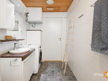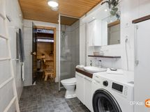 - Sauna, sähkökiuas, kylpyhuone, suihku, suihkuseinä, peilit, peilikaappi, kaapit, allaskaappi, pesukoneliitäntä, lattialämmitys (sähköinen), kiinteät valaisimet. Pyykinpesukone . Saunassa ikkuna