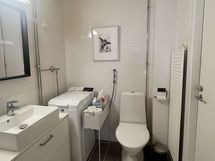 - Suihku, Lasinen suihkuseinä, Pesukonevalmius, Allaskaappi, Laattalattia, Laattaseinä