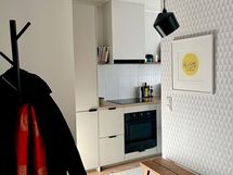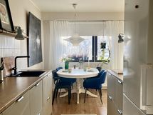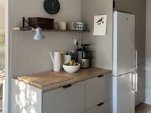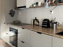 - Laminaattitasot, Integroidut koneet, Induktioliesi, Liesikupu, Jää-pakastinkaappi, Tila ruokapöydälle, Runsaasti työskentelytilaa, Reilusti kaappitilaa, Upotettu allas, Yksiotehana
