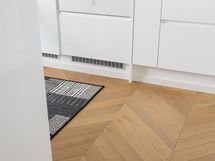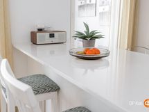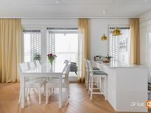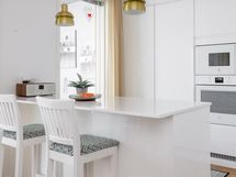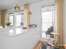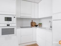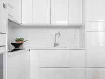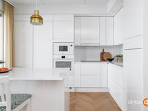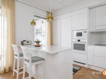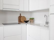 - Jääkaappi integroitu, pakastekaappi integroitu, induktioliesi, liesituuletin, mikroaaltouuni, astianpesukone, kaapistot, kiinteät valaisimet.