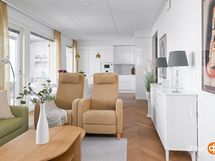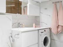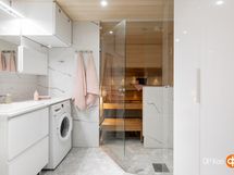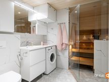 - Sauna, sähkökiuas, kylpyhuone, erillinen wc, suihku, suihkuseinä, peilikaappi kph:ssa ja wc:ssa, kaapit, allaskaappi kph:ssa ja wc:ssa, pesukoneliitäntä, lattialämmitys, kiinteät valaisimet.