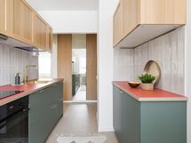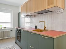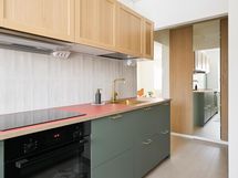 - Jääkaappipakastin integroitu, erillisuuni, liesitaso, liesituuletin, astianpesukone integroitu, kaapistot, kiinteät valaisimet.