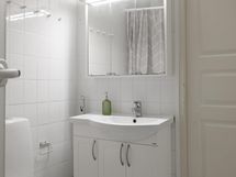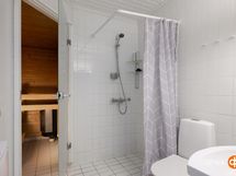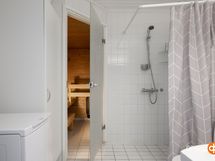 - Sauna, sähkökiuas, kylpyhuone, suihku, peilikaappi, allaskaappi, pesukoneliitäntä, kiinteät valaisimet.