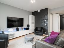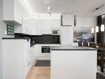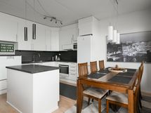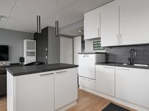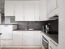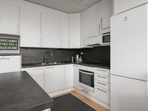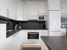 - Keittiön varusteet: Jääkaappipakastin, liesituuletin, astianpesukone, erillisuuni ja induktiokeittotaso. Liesi: Induktioliesi. Työtason materiaali: Laminaatti.