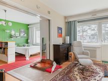 Läpitalon huoneisto tarjoaa valoisuutta ja avaruutta. Reilunkokoiset huoneet mahdollistavat monipuoliset kalusteratkaisut ja huoneet mukautuvat erilaisiin asumistarpeisiin. Asunnon tunnelmaa korostavat kauniit alkuperäiset komerot, leveät ikkunalaudat sekä olohuoneen ja toisen makuuhuoneen välinen seinän sisään liukuva ovi, joka tuo tilaan käytännöllisyyttä ja persoonallista ilmettä.