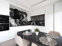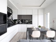 - Keittiön varusteet: Jääkaappi, jääkaappipakastin, erillisuuni, liesi, liesituuletin, mikroaaltouuni ja astianpesukone. Liesi: Induktioliesi. Työtason materiaali: Laminaatti. Rakennustapaselosteen mukainen varustus.