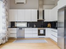 - Työtasot: kivi. Liesitaso, kalusteuuni, liesituuletin, korkeat jääkaappi ja pakastin, astianpesukone. Kivityötasot.