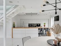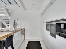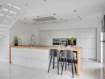 Jääkaappi, pakastin, astianpesukone, liesi, kattoon integroitu liesituuletin, kahvikone, mikro, uuni, allas.