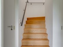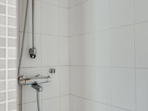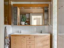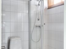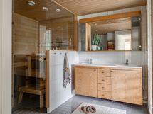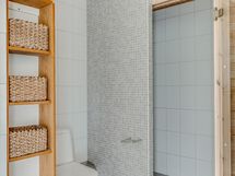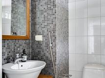 - Pesutilojen kuvaus: Yläkerran pesuhuoneen varustus: Suihku, suihkuseinä, wc-istuin, bidee, allas/taso ja peili. Lattia ja seinät on laattaa.
