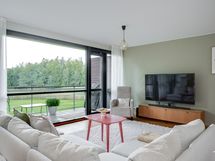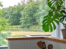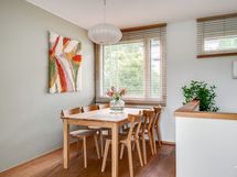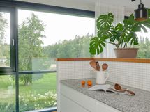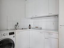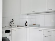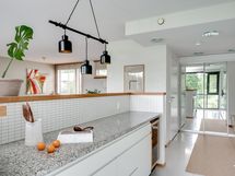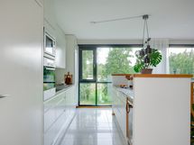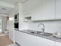 - Hyvin varusteltu avokeittiö, jonka kaappien ja laatikoiden etusarjat on uusittu vuonna 2021. Varustus: jääkaappi/pakastin, liesi, kalusteuuni ja -mikro, integroitu astianpesukone, viinikaappi ja liesituuletin. Tasot on kiveä ja lattia on laattaa.