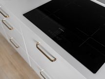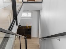 Yläkerta hurmaa heti. Avara ja yhtenäinen oleskelutila yhdistää keittiön ja olohuoneen näyttäväksi kokonaisuudeksi, jossa suuret lattiasta kattoon ulottuvat ikkunat kahdesta suunnasta tuovat valon ja vuodenaikojen vaihtelun osaksi sisustusta. Tämä on tila, jossa arki rullaa vaivattomasti ja juhlat järjestyvät tyylillä.