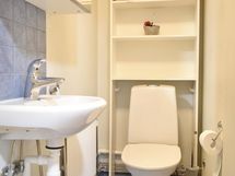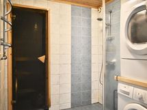 Kylpyhuone, erillinen wc, puusauna, peilikaappi, pesukoneliitäntä, lattialämmitys, kylpyhuonekaapisto, kiinteät valaisimet