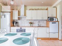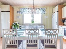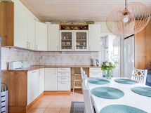 Keittiön varusteet: Jääkaappi, liesi, liesituuletin, erillisuuni ja astianpesukone. Liesi: Leivinuuni ja induktioliesi. Työtason materiaali: Laminaatti.
