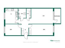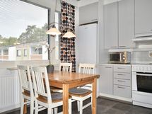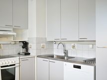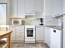 - Kaapistot, astianpesukone, keraaminen liesi, liesituuletin, jääkaappi/pakastin. Lattia: Muovi
