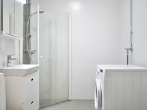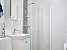 - Kylpyhuone, suihku, pesukoneliitäntä, peilikaappi. Lattia: Laatta. Seinät: Laatta