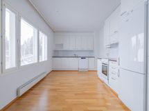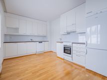 - Keittiön varusteet: Jääkaappipakastin, liesituuletin, liesi ja astianpesukone. Liesi: Keraaminen liesi. Työtason materiaali: Laminaatti.