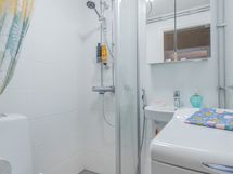 - Pesutilojen varusteet: WC-istuin, suihku, suihkuseinä, pesuallas, peilikaappi, bidee-suihku ja pesukoneliitäntä. Pesutilojen kuvaus: Kylpyhuone uusittu 2022-2023 taloyhtiön käyttövesiputkiremontin yhteydessä.