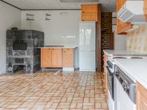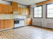 - Jääkaappi/pakastin, kaapistot, sähköliesi, liesituuletin/hormi/suodatin, leivinuuni. Keittiössä laattalattiat, puolipaneloidut/tapetoidut seinät, levykatto.
