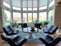 Tässä kodissa yhdistyvät laadukkaat materiaalit, ajattomat ratkaisut ja huolellinen ylläpito. Lattiat ovat kauniisti parkettia ja laattaa, ja tilat huokuvat laatua ja harmoniaa.