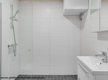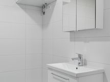 - Kylpyhuone, pesualtaan yhteydessä allaskaappi/-laatikosto ja peili tai peilikaappi valaisimella, suihku