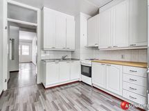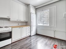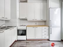 - Liesi: sähköliesi. Työtasot: laminaatti. Kylmäsäilytys: jääkaappi/pakastin. Varustus: liesituuletin / suodatin. Valkoiset mdf-peiliovet kaapistoissa, jotka uusittu n. v. 2000.