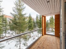 Kylpyhuoneiden ja saunan lattiat ovat klinkkerilaattaa. Kylpyhuoneiden seinät ovat laattaa. Saunan seinissä on panelointi lämpökäsiteltyä haapaa. Katot ovat lämpökäsiteltyä haapaa. Saunassa sähkökiuas.