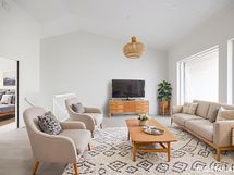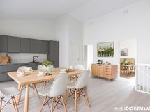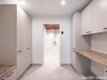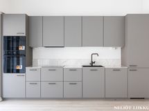 - Noblessa keittiö, jossa Divine lakkalaminaatti Taupe, sormenjälkiä hylkivä pinnoite. Pronssin värinen metallivedin alakaapeissa. Taso keraaminen Golden white. Integroitu Whirlpool uuni sekä mikroaaltouuni, Whirpool induktiotaso, integroitu astianpesukone, integroitu liesituuletin sekä jääkaappi ja pakastin. Tyylikäs vaalean tammen sävyinen vinyylikorkkilattia.