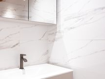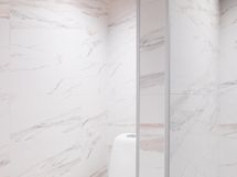 - Pesutilojen kuvaus: Lattiassa limestone light grey 10x10 laatta. Seinissä Marble gold glossy 30X60 laatta.