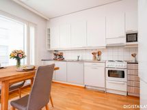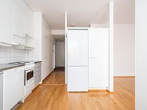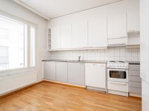 - Jääkaappipakastin (2020-luvulla uusittu), sähköliesi, liesituuletin (hormiin), astianpesukone, kaapistot, kiinteät valaisimet.