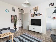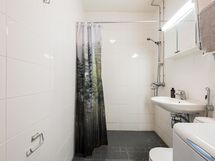 - Kylpyhuoneessa on suihku, peilikaappi, pesukoneliitäntä ja kiinteät valaisimet.