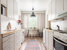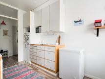 - Keittiön varusteina on jääkaappi, pakastekaappi, lattialiesi, liesituuletin, mikroaaltouuni, astianpesukone, kaapistot ja kiinteät valaisimet.