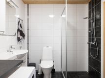 - Pesutilojen varusteet: Suihkuseinä, allaskaappi, pesukoneliitäntä, lattialämmitys, peilikaappi, wc-istuin, suihku ja kiinteät valaisimet. Erillisten WC:n lukumäärä: 1.