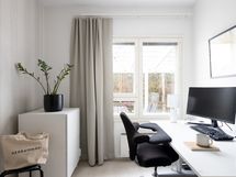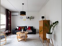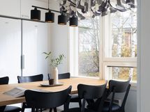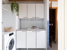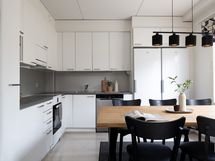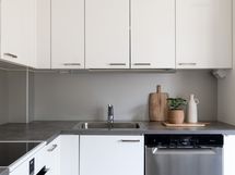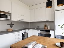 VARUSTUS: Keittiö saneerattu 2017, ovet uusittu, mutta rungot ovat alkuperäiset. Jääkaappi 2019, pakastin 2019, astianpesukone 2024, induktiokeittotaso 2020, uuni, liesituuletin, paikka mikrolle.