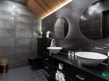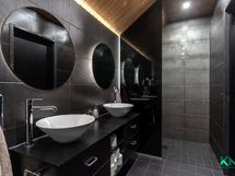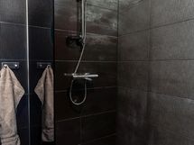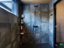 - Yläkerrassa kph/wc, jossa suihku, seinä-wc-istuin, peilit, allaslaatikostot. Lattia ja seinät laattaa. Alakerrassa kodinhoitohuone, jossa kaapisto, pesukoneliitäntä, lavuaari, käynti ulos. Seinät maalattua/hirttä, välitilassa levyä, lattia laattaa. Kph, jossa kaksi suihkua (vaihdettu 2025). Seinät ja lattia laattaa. Saunan ja kph:n välissä lasiseinä. Saunassa lattia laattaa, seinät paneelia. Harvian pilarikivikiuas (2025).