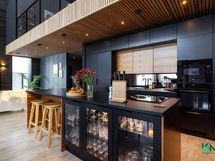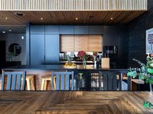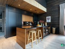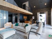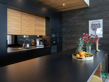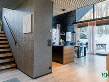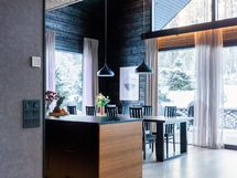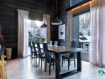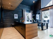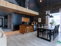 - Gastro-keittiö. Jääkaappi, pakastin, kiertoilmauuni, induktioliesi, tasotuuletin, astianpesukone (2023, integroitu), integroitu mikro, kaapistot. Tasot laminaattia, seinät hirttä, lattia laminaattia, välitilassa peili. Keittiön vieressä tila isolle ruokapöydälle.