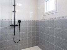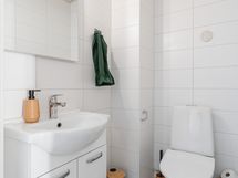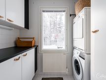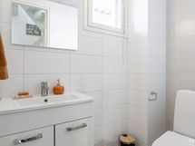 - Varusteet: lattialämmitys. Laatoitettu kylpyhuone pukeutumistilalla. Pesutorni mahtuu myös tähän tilaan (tällä hetkellä se on alakerrassa). WC: Molemmat WC:t laatoitetut, katot sormipaneelia. Alakerran WC ikkunallinen. Varusteet: allaskaappi, peili