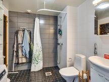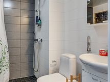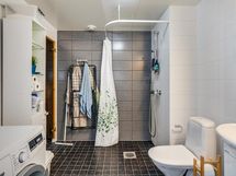- Suihku, tanko suihkuverholle, wc-istuin, bidee, pesuallas, alakaapit, peilikaappi, kiinteät valaisimet, pesukoneliitäntä, sähköinen lattialämmitys huoneiston omaan sähkölaskuun, sähkösauna