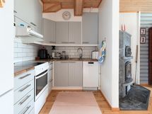 Jääkaappi/pakastin (2023), astianpesukone (2023), sähköliesi (alkuperäinen), liesituuletin, kaapistot